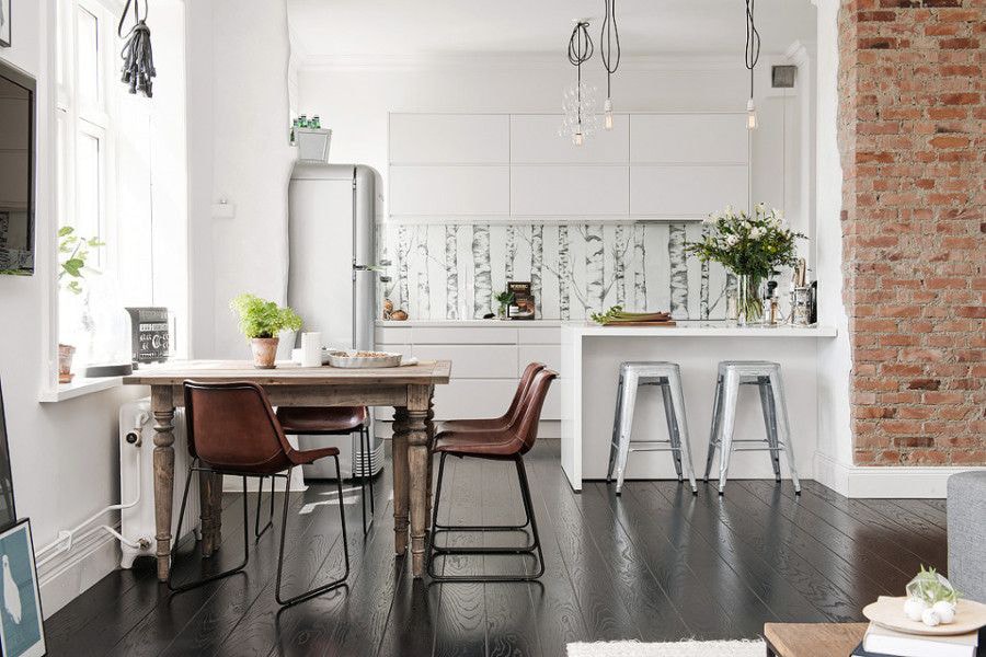 При этом, барная стойка может служить как самостоятельной обеденной зоной (для небольшой семьи), так и дополнительным местом для быстрых перекусов. Если место в кухне-гостиной или студии позволяет, то лучше установить и отдельную полноценную обеденную группу, например, для приема гостей.