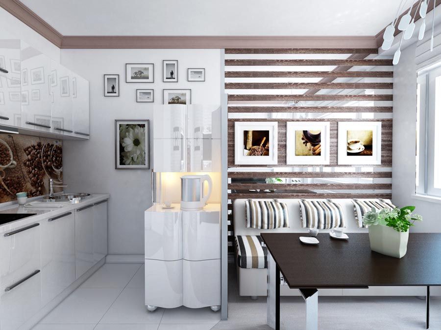 Для большинства семей самое оптимальное решение – распределить место между кухней и гостиной примерно поровну. Для большинства семей самое оптимальное решение – распределить место между кухней и гостиной примерно поровну. Сделать это можно как капитальным способом (снести перегородку), так и временным (поставить диван или обеденную группу). Рассмотрим варианты
