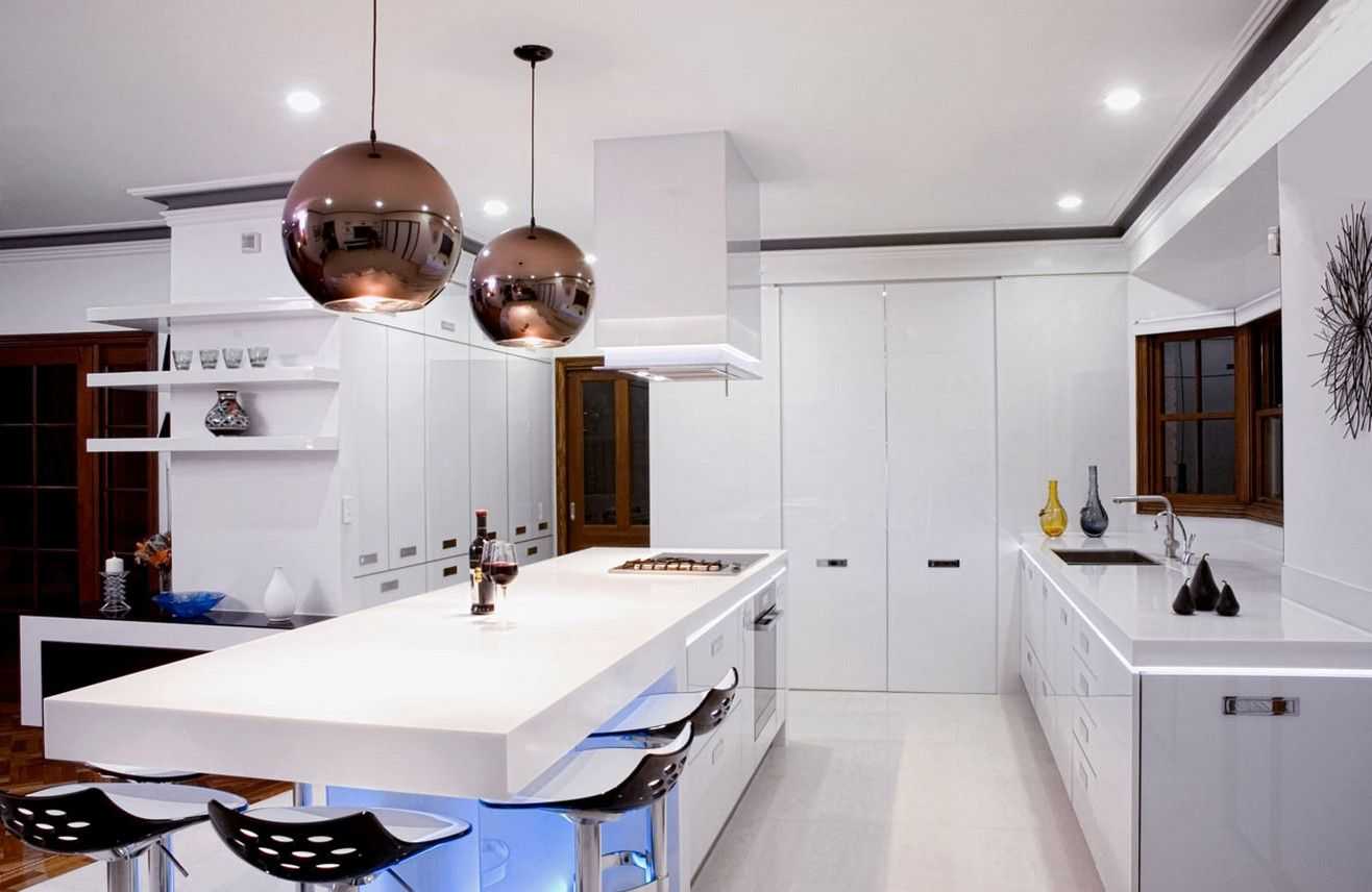 Чтобы кухня, совмещенная с гостиной, выглядела более оригинально и стильно, следует уделить внимание световому оформлению барной стойки, используемой в качестве центрального элемента интерьера такого помещения. Для реализации такой задачи можно использовать как подвесные светильники, так и светодиодную подсветку, установленную под столешницей