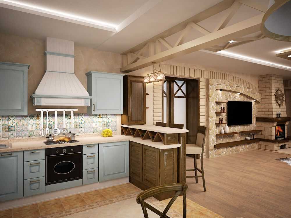 - Деревенские, средиземноморские и романтические стили (прованс, кантри). Подойдут невысокие барные стойки, с резными деталями в пастельных тонах. Лучше, если мебель будет оформлена в ретро-формате. Нижняя часть обязательно должна быть закрыта и иметь места для хранения.