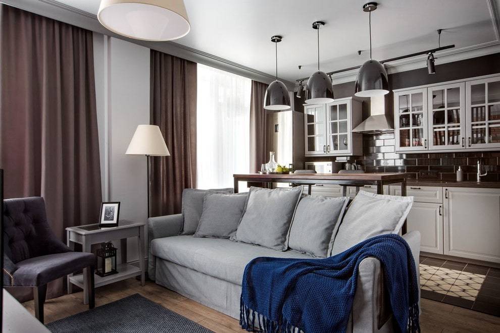 Удачное решение оформления интерьера совмещенного пространства хрущевки представлено на фото:
