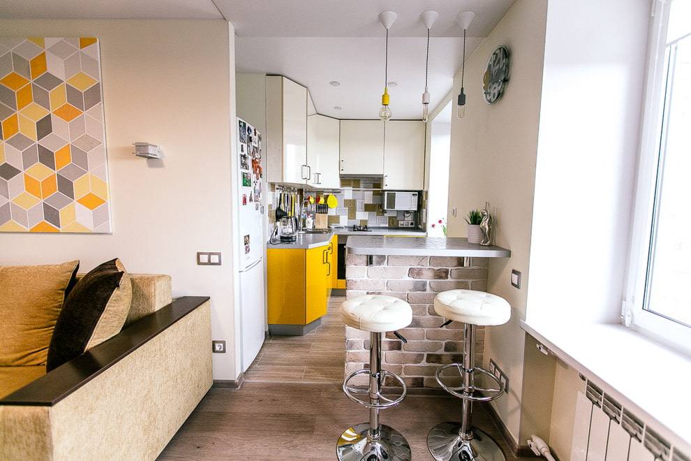 Дизайн гостиной, совмещенной с кухней, в хрущевке.