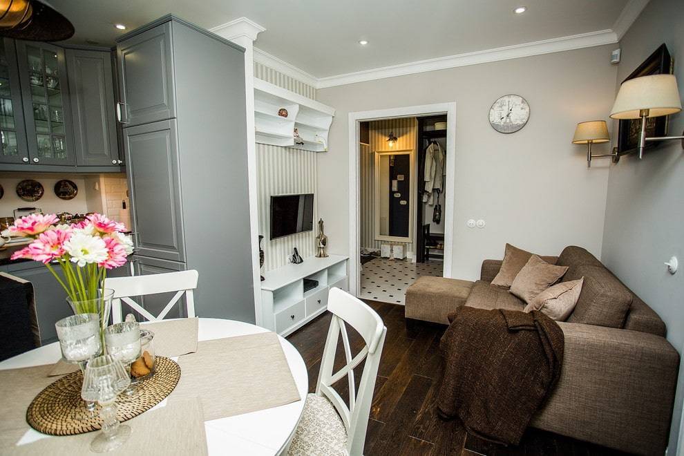 - Несмотря на некоторые сложности при совмещении кухни с гостиной, этот вариант идеально подойдет для маленькой квартиры.