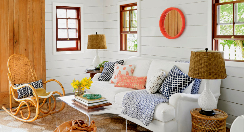 Кстати, такой стиль называют сегодня скандинавским, и используют его уже довольно часто. На стене желательно повесить большое зеркало. Также гостиную украсят семейные фото в светлых рамках, несколько подвесных вазонов с живыми цветами, настенные светильники. Актуальные цвета для аксессуаров: оранжевый, сочный зелёный, коралловый, клеверно-розовый.
