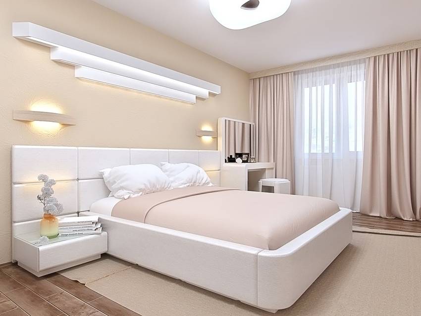 Дизайн с рассеянным светом. Не надо устанавливать большие светильники и люстры, у которых плафоны смотрят вниз. Для маленького пространства лучше подойдут точечные светильники, расположенные по периметру. Дополнительное освещение. Его можно установить возле кровати на мебели, например, лампы