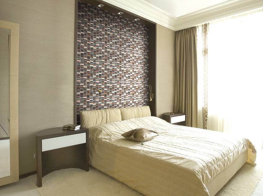 В узких спальнях акцентную отделку можно сделать у стены в изголовье, которая будет переходить в потолок. Это позволит сделать вытянутое помещение пропорциональным по размерам.