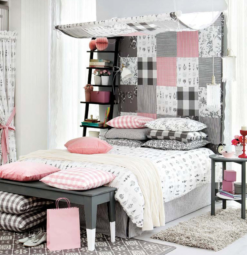 К декору относят также и текстиль. Если комнату нельзя украсить многочисленными аксессуарами, тогда достаточно оформить подушки в красивые наволочки, застелить постель красивым ярким покрывалом. Делать акцент на кровати уместно для любого помещения, в каком бы стиле он ни был бы оформлен. Здесь допускаются 2-ярусные или 3-ярусные шторы, портьеры с ламбрекенами. Пол можно украсить одним или двумя (с обеих сторон двуспальной кровати) маленькими, но стильными ковриками.