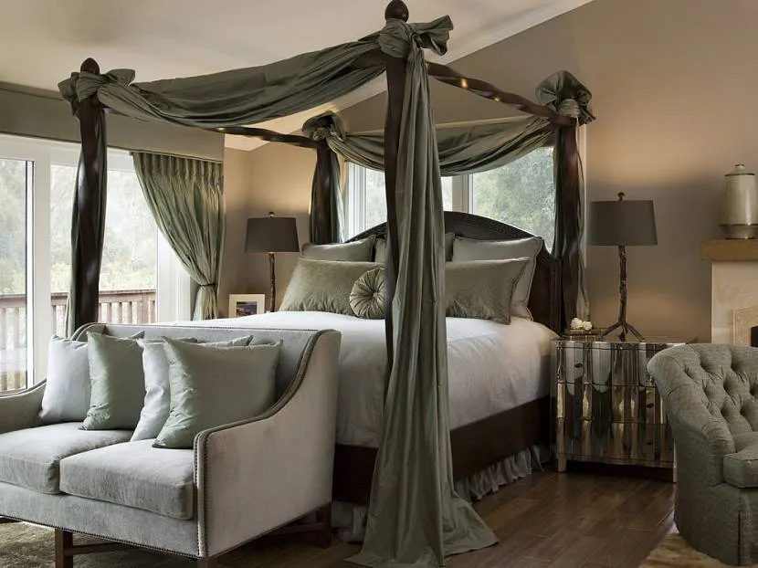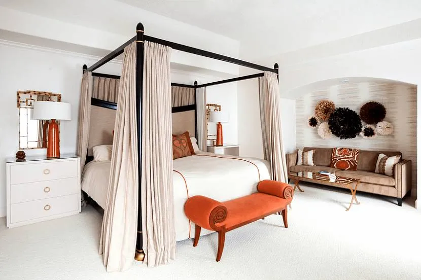 Цвет балдахина в спальне должен сочетаться с текстильным оформлением комнаты, чаще всего в тон идут шторы. Гармоничное сочетание по теплоте с ковровым покрытием, материалами постельного белья, покрывалом и обивкой мебели в спальне.