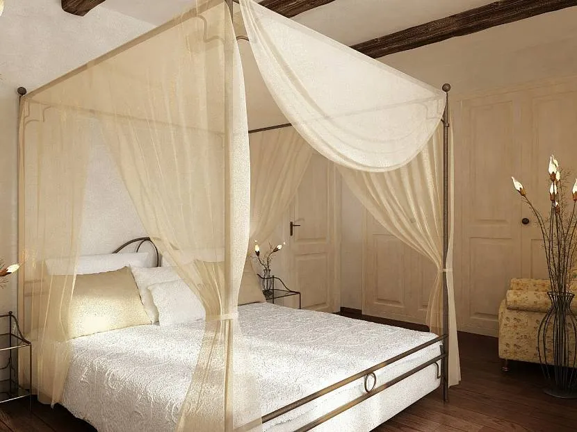 Полупрозрачные ткани достаточно плотные, чтобы приглушать свет и создавать интимную обстановку внутри полога. Предпочтение рекомендуется отдавать светлым цветам: снежно-белый, молочный, бежевый. Для тех, кто хочет что-то необычное, глубокие, сложные цвета: оливковый, винный, изумрудный. В моде горчичный и темно-синий (цвет океана). Нередко используется чёрный или темно-коричневый, шоколадный (в стиле лофт или хайтек). На пике серый, графитовый, мокрый асфальт – все они прекрасно сочетаются с другими цветами, нейтральны. На таком фоне удобно создавать яркие акценты в дизайне спальни.