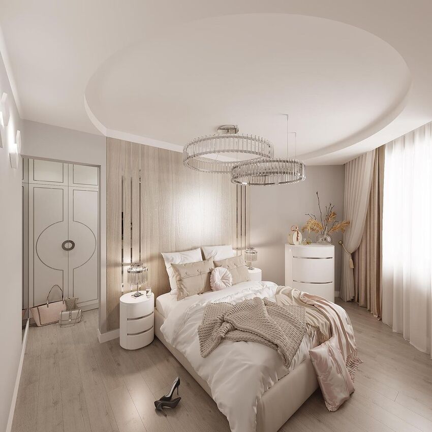 Потолочную плоскость в бежевой спальне можно побелить, покрыть водоэмульсионной краской, оформить обоями, оборудовать натяжной или подвесной потолок в светлом исполнении.