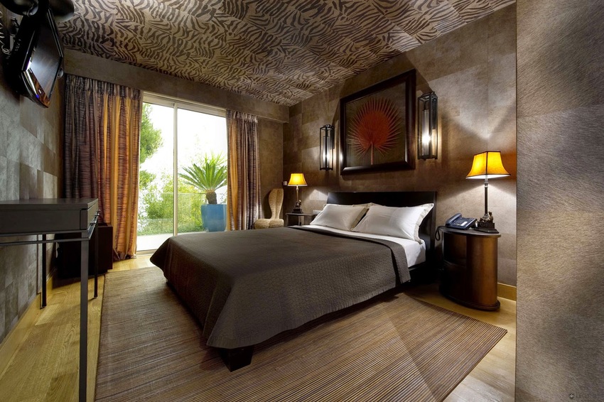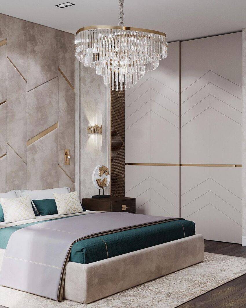 Арт-деко. Здесь бежевый цвет отлично гармонирует с роскошными шторами, множеством зеркал, крупными навесными люстрами, необычными кроватями и стульями.
