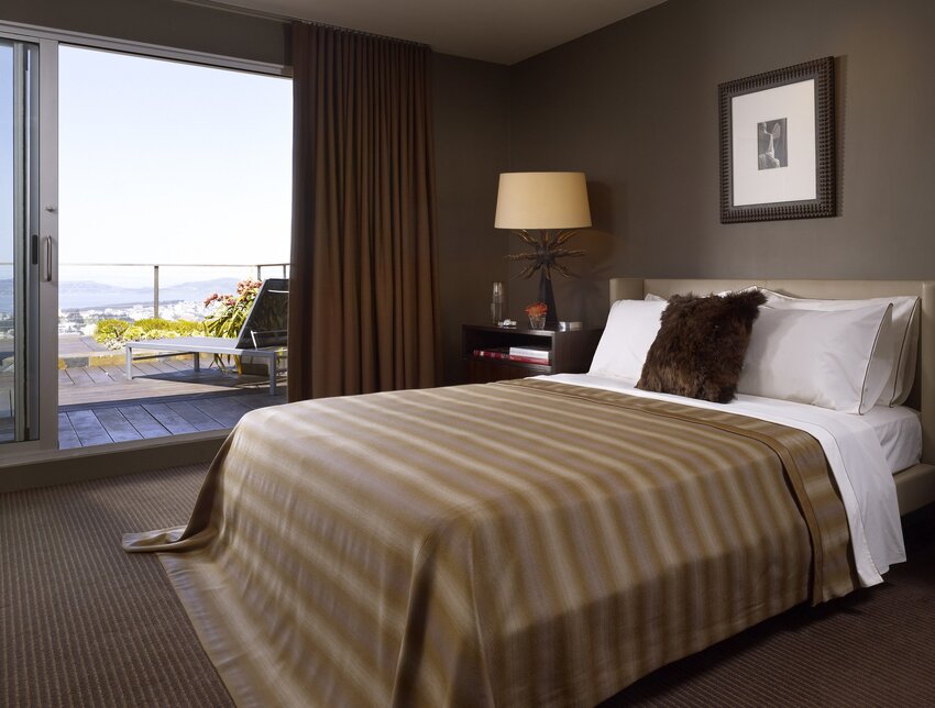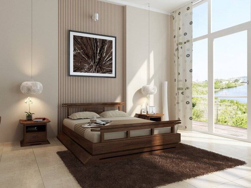 В коричневой спальне желательно иметь большие окна, так как в этом пространстве особое внимание уделяется поступающему количеству дневного света
