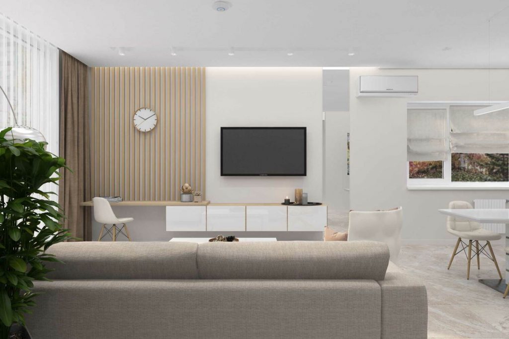 Для зала в квартире студии лучше всего выбрать современный стиль: скандинавский, хай-тек, минимализм, модерн. Лаконизм и простота таких стилей как нельзя лучше подходят для многофункционального помещения.