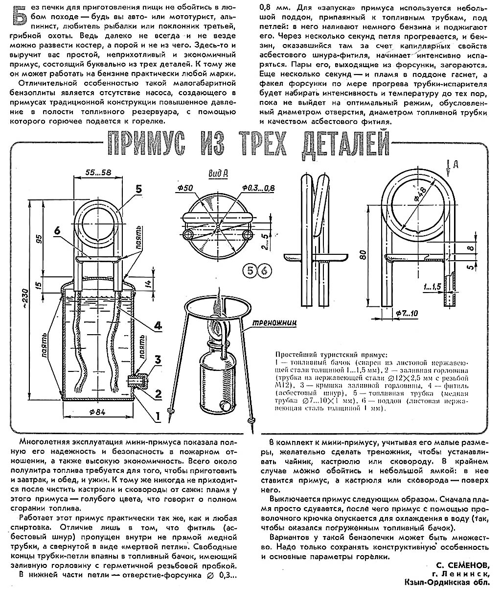 - в топочную часть поместить чашку с горючим, при этом проследить за тем, чтобы конец медной трубки располагался непосредственно над этой ёмкостью;