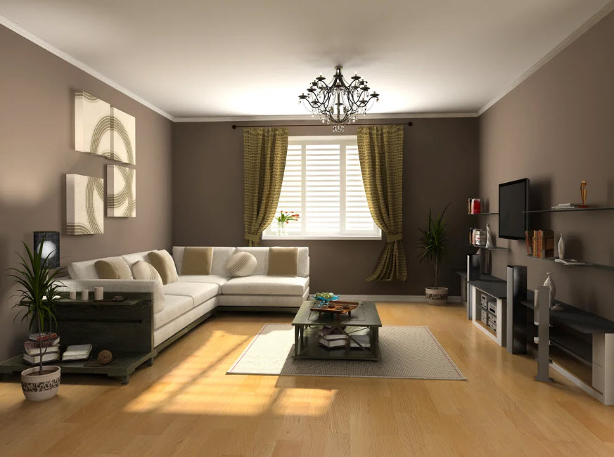 Самая распространенная цветовая гамма для зала — это светлые тона. Это не удивительно: бежевые, песочный,коричневый создают ощущение обволакивающего комфорта и расслабления. Такие цвета располагают к отдыху после долгого трудового дня. Вопрос с маркостью можно решить с помощью более темной обивки дивана и другой мягкой мебели. Отлично подойдут глубокий синий, изумрудный, бордовый, шоколадный.