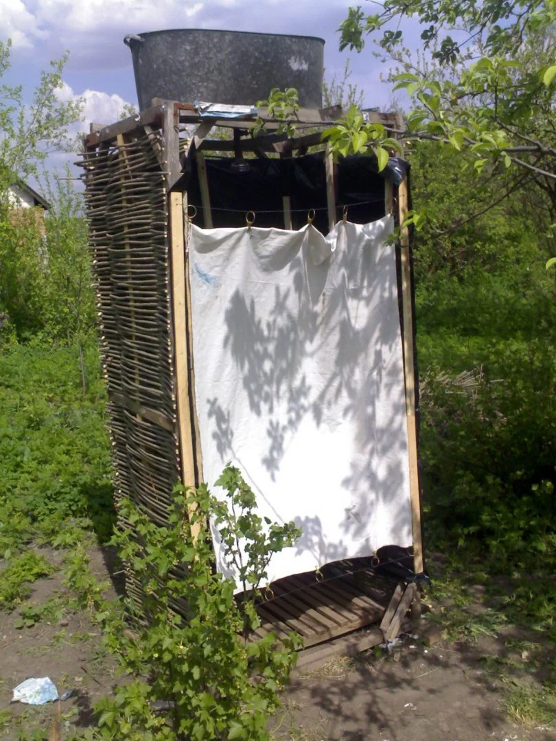 Нужно установить четыре столба, закрепить над ними бак для воды, который оборудован душевой сеткой и вентилем, и натянуть между столбами ткань, непрозрачную пленку или брезент.