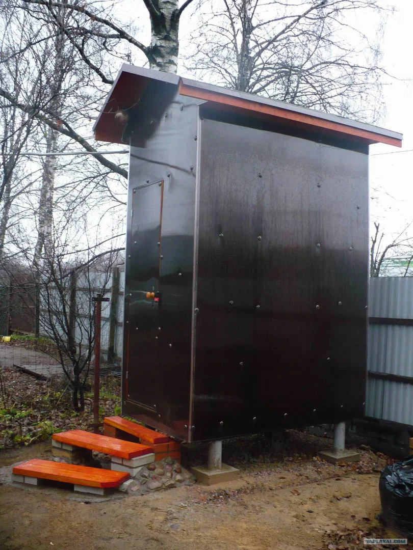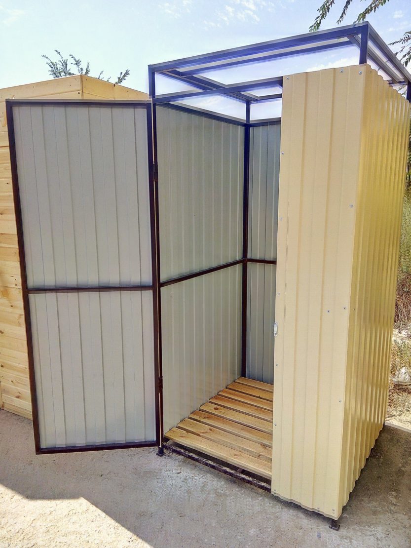 - Каркас сколачивают из бруса. Стенки и дверь можно смастерить из профилированного железа, поликарбоната, брезента.