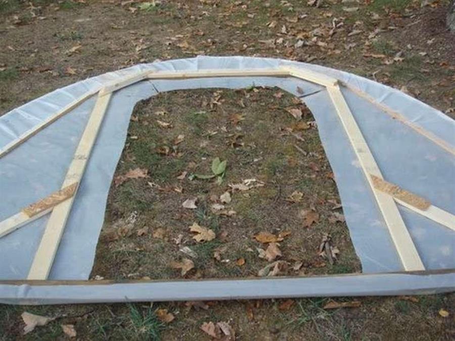 Из деревянных планок, пластиковой трубы и полиэтиленовой пленки собираются торцевые стенки: