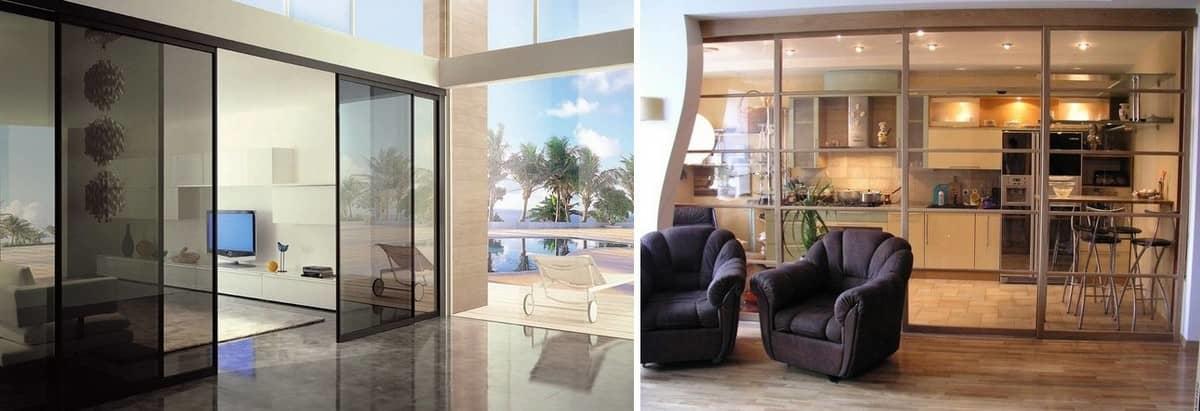 Металлопластиковые и деревянные сдвижные двери с остеклением весьма популярны. Конструкция состоит из цельного стекла и алюминиевой или деревянной коробки. Как правило, полотно сдвигается только в одну сторону. Двойные могут сдвигаться в разные.