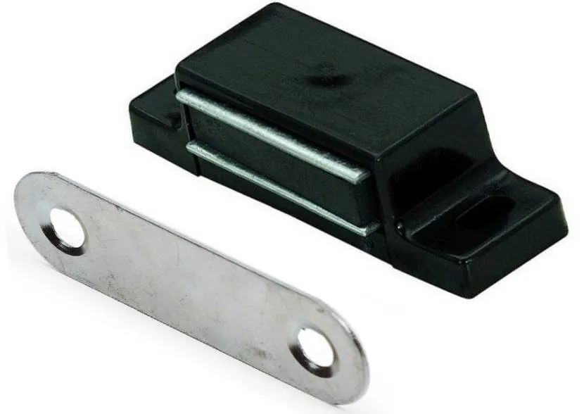 - Пассивное. Является аналогом мебельным моделей – когда на корпусе устанавливается магнит, а на дверце металлическая пластина. При контакте по естественному свойству металл притягивается, что способствует удержанию полотна от открывания. Чтобы разблокировать дверь – нужно просто приложить усилие.