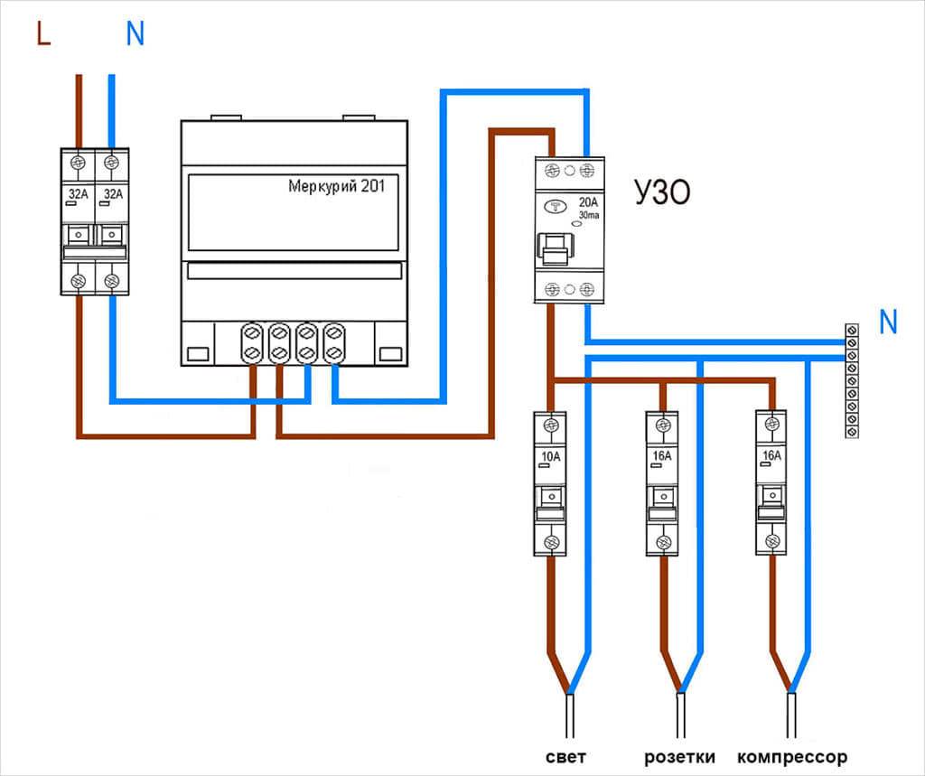 После вводного автомата подключают прибор учета электроэнергии. Обычно это бытовой счетчик, например, Меркурий 201. Выходящие из счетчика фазный и нулевой проводники подключают к УЗО (устройству защитного отключения). Наличие УЗО необходимо для защиты людей от поражения электрическим током. Когда человек прикасается к неизолированному проводнику, находящемуся под напряжением, через его тело начинает проходить ток утечки. Чтобы значение тока утечки не достигало опасного для жизни значения, УЗО отключает подачу напряжения.