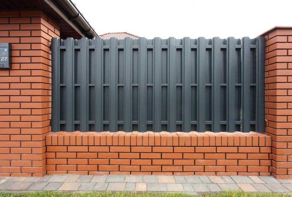 Евроштакетник удачно сочетается с кирпичом и камнем. Можно вылить колонны из красного кирпича и сделать секции ограждения из коричневого штакетника. В результате получится стильный и солидный забор.
