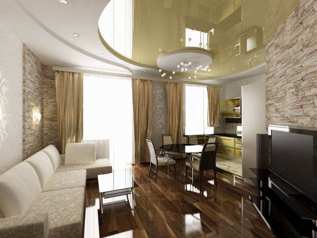 Подвесной вариант конструкции в комплексе с натяжным потолком приобретает популярность. Комбинация полотна и гипсокартонной конструкции чаще используется в зале или гостиной. Гипсокартонный короб штукатурят и покрывают лепниной.