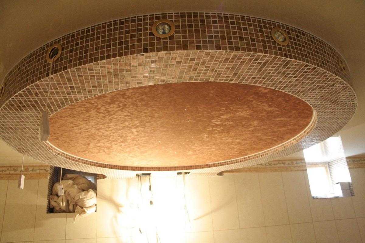 Каркас в виде круга из мозаики в сочетании с фактурным натяжным потолком – отличное решение для ванной комнаты