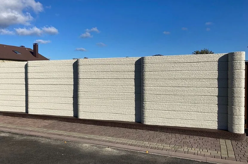 Изгороди из бетона состоят из отдельных блоков и опорных столбов. У них продолжительный срок эксплуатации. Также есть возможность возвести их за короткий промежуток времени. Бетонный забор возводится на любой почве. Но такое строительство обойдется довольно дорого. Для его монтажа придется нанимать строительную технику. Нужно обязательно соблюдать технологию при возведении изгороди, в противном случае он перекосится после первой же зимы. Пример ее изображен на фото.
