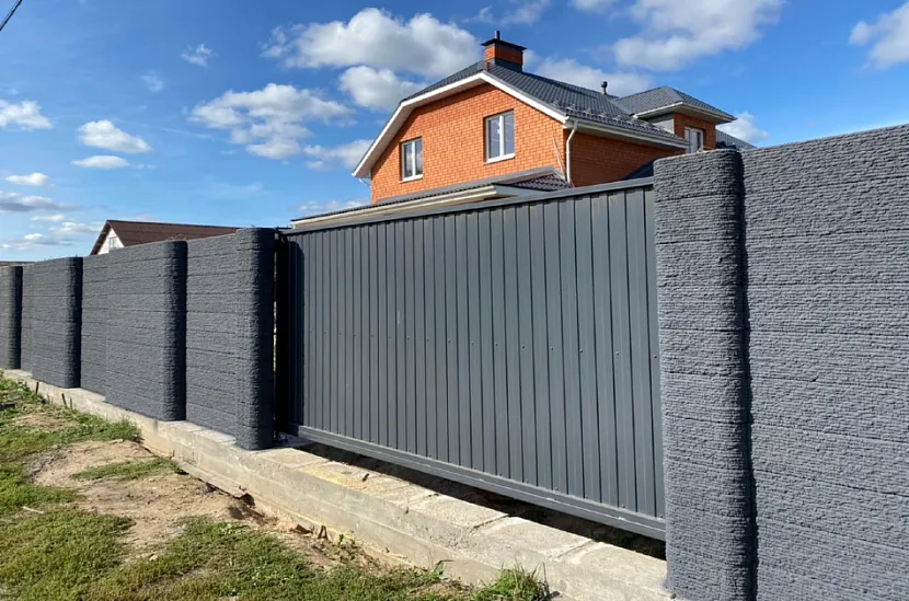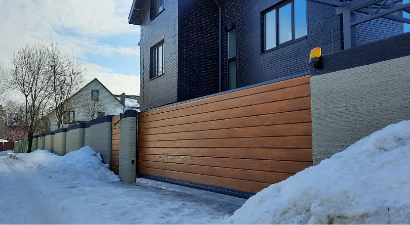 Крафтовый забор с откатными воротами и калиткойИсточник novacon.pro