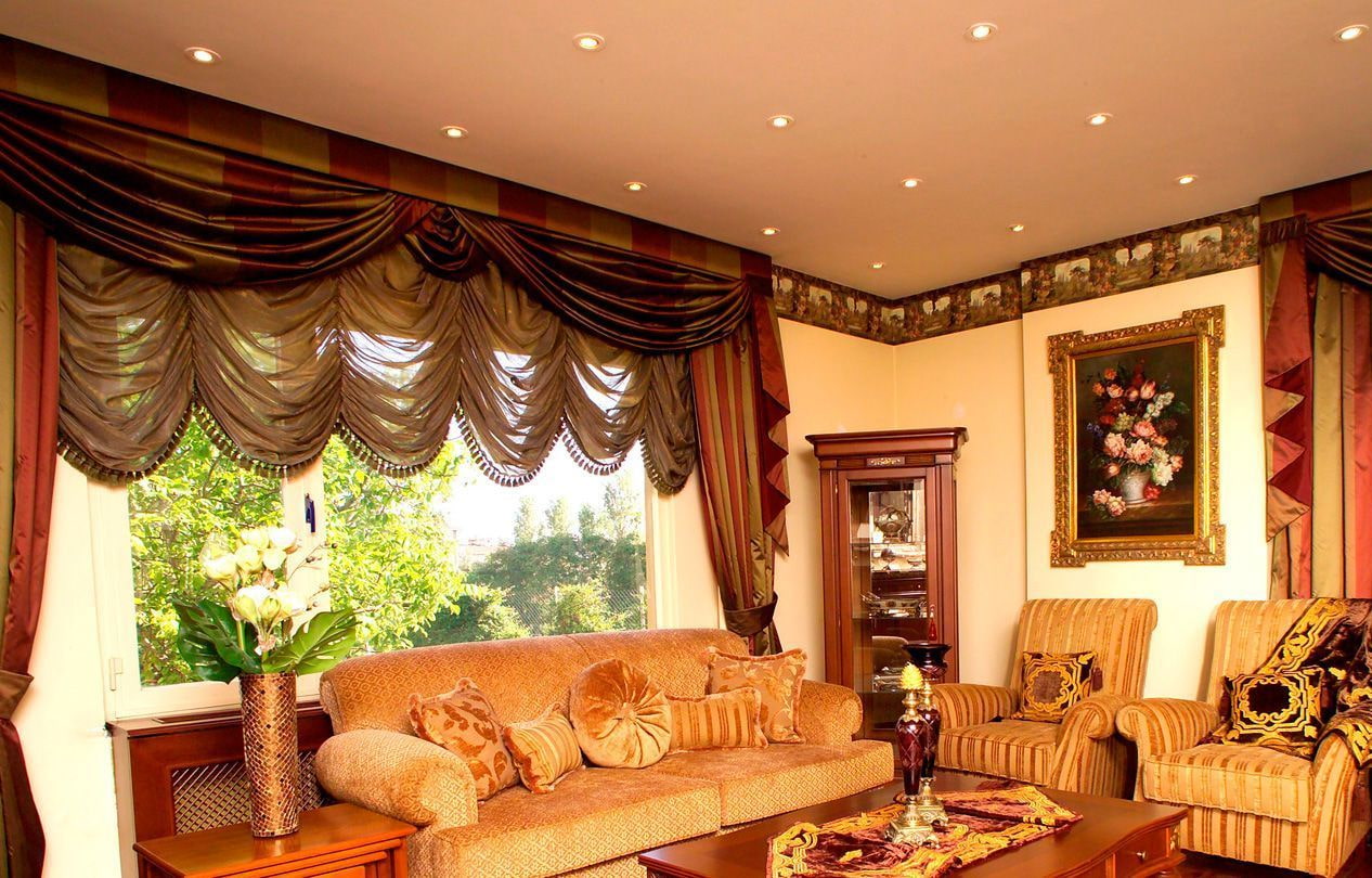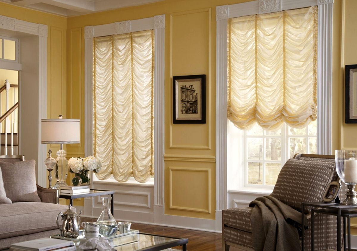 - Каскадно-подъемные шторы – традиционное украшение для окон «второго света».