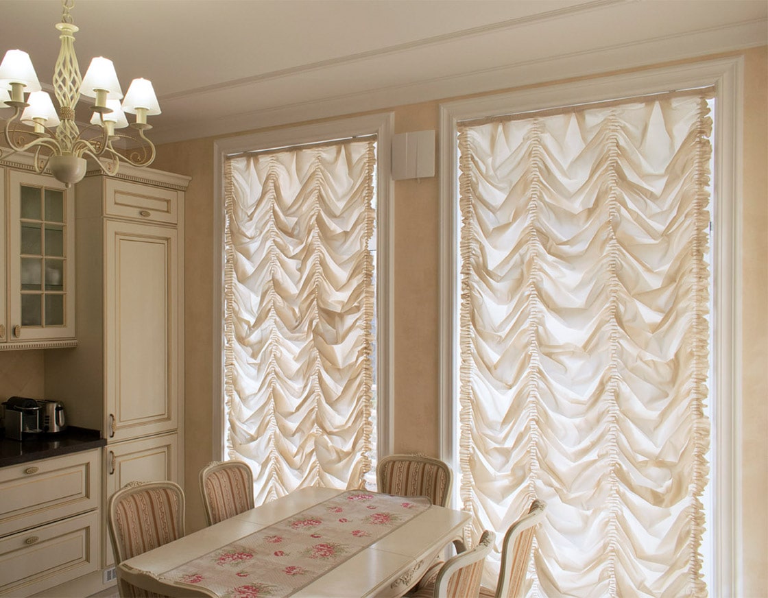Размер фестонов во многом определяется шириной окон, широкие складки более уместны на большом оконном проёме.