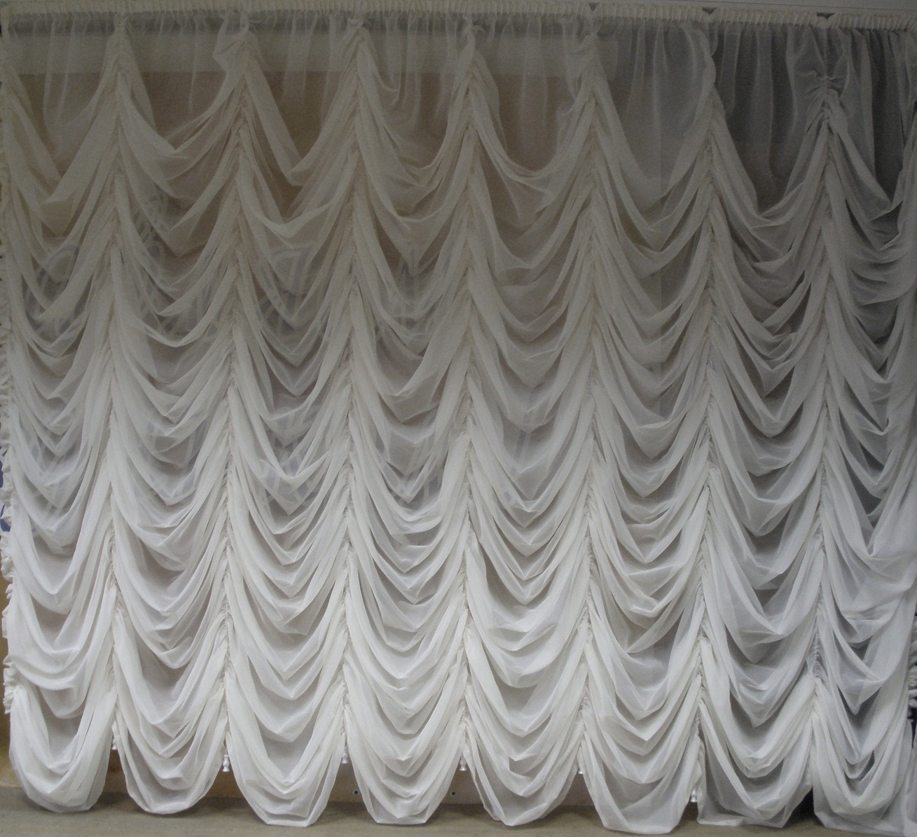 Также можно формировать драпировки с помощью пришитых на кулисках через каждые 20 см колец, либо воспользоваться узкой драпировочной лентой для драпировки по высоте.