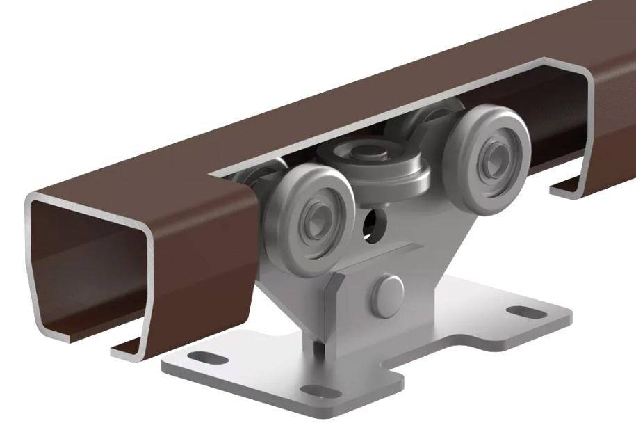 ограничитель бокового качания полотна. Существует много конструкций этого элемента — от самой простой (горизонтальный диск над кареткой или верхней кромкой полотна), до более сложных конструкций с несколькими роликами (до 4 штук в одной сборке). Чем тяжелее ворота, тем больше требуется ограничителей.