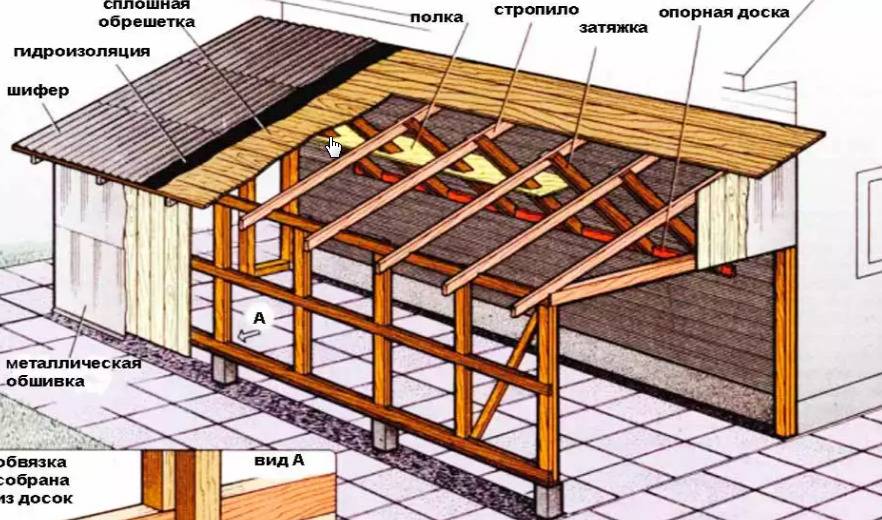 - смонтировать односкатное перекрытие на деревянном каркасе;