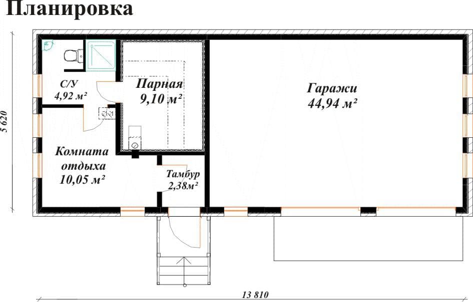 Вариант планировки деревянного гаража с баней и комнатой отдыха