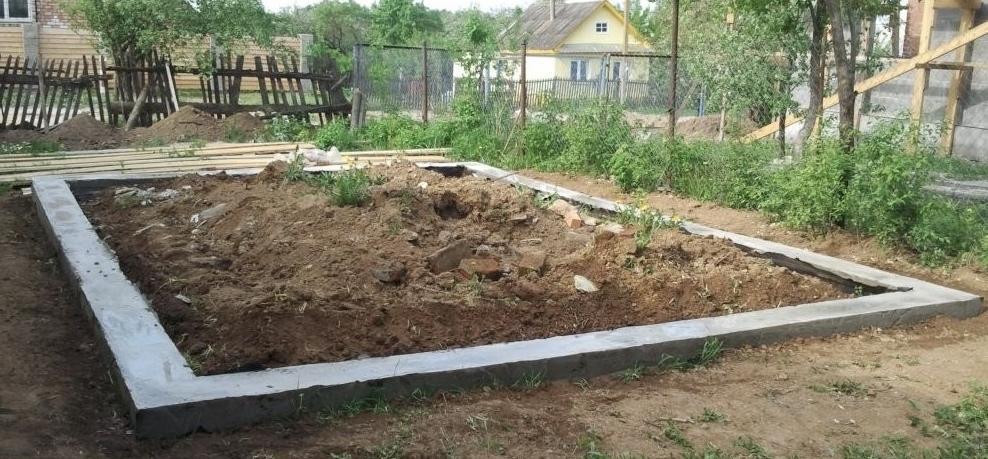 Далее переходят к земельным работам. На ширину будущих стен и глубиной порядка 1 м по всему периметру роется траншея. Глубина может колебаться в зависимости от типа грунта. На дно траншеи засыпается песок и гравий для создания подушки. Остальная часть канавы укладывается гидроизоляцией, далее выполняется установка арматуры или арматурной сетки. В завершение все заливается бетоном. После этого порядка месяца он застывает. Лишь потом можно приступить к возведению стен.