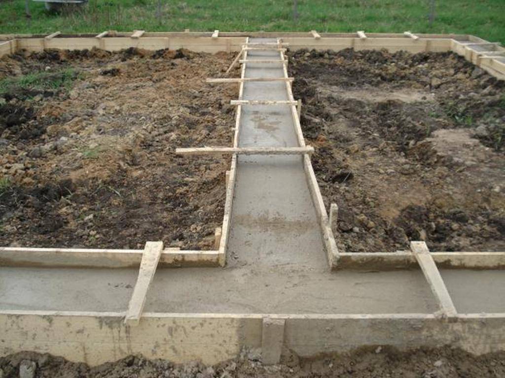 Внутри траншеи возводят опалубку. Устанавливают каркас из арматурных материалов (лучше всего использовать прут сечением 1,4 см), сваренный в виде сетки с ячейками 10х10 см.