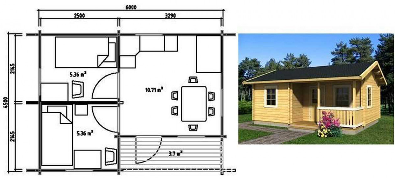 Планировка дачного дома маленькой площади (до 40 метров) совсем проста: обычно это две комнаты, первая из которых используется как кухня и столовая одновременно. Чаще всего она является проходной. Вторая комната жилая. Более-менее комфортно разместить тут можно два спальных места. Так что проекты дачных домов с мансардой 6*4 метра рассчитаны на проживание 1-2 человек.