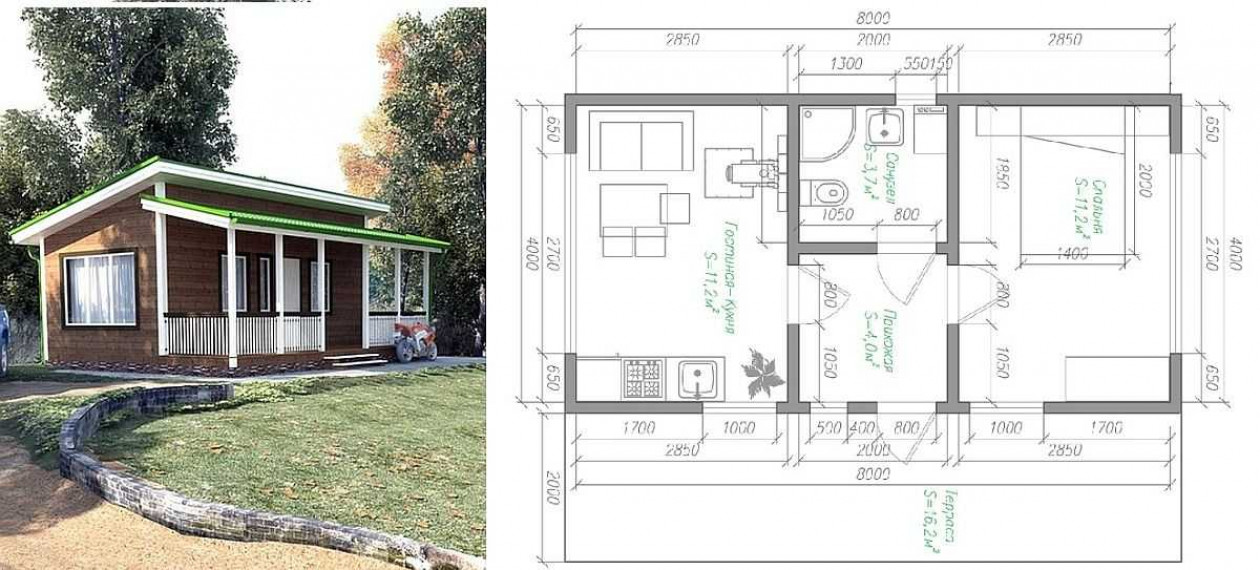 Проекты дачных домов с верандой есть небольшой площади: самые маленькие имеют размеры 6*4 метра, причем веранда занимает 2 метра по длинной стороне, а собственно дом — 4*4 метра или 16 квадратных метров (с учетом толщины стен и того меньше).