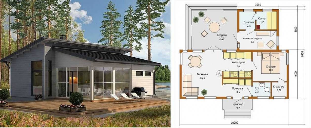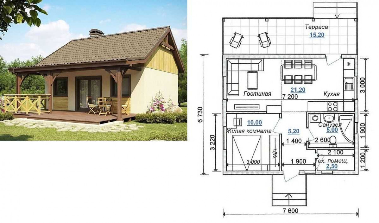 Если бюджет строительства сильно ограничен, рассмотреть проекты дачных домов с односкатной крышей. Они непривычны для нашей станы, но стоимость кровли при небольшой площади намного меньше. Только надо выбрать правильный угол уклона кровли (с учетом величины снежного покрова).