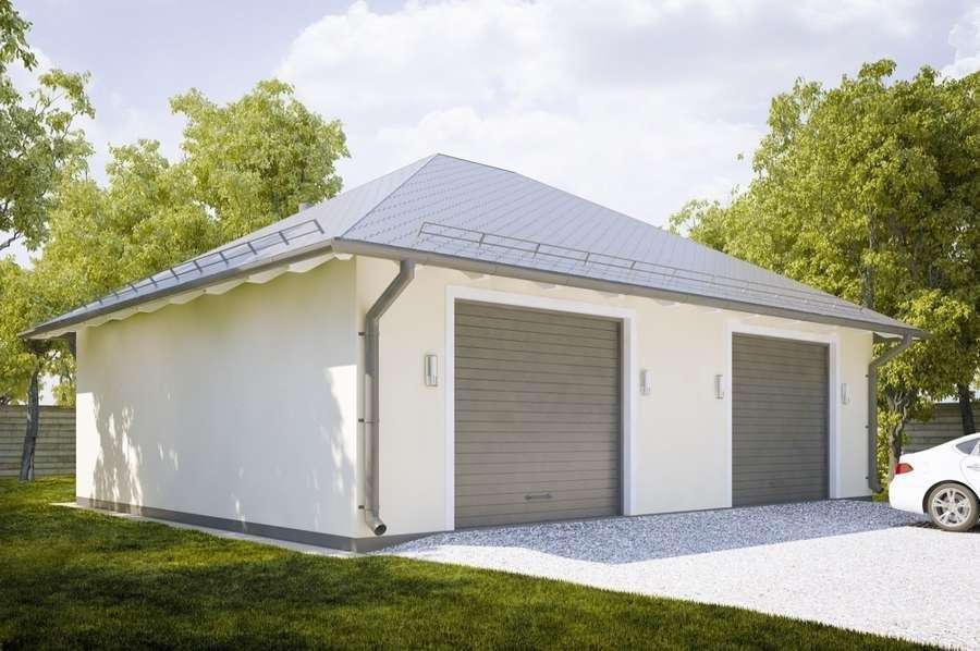 Гараж на две машины можно сделать с шатровой крышей, это вид крыши, где все стороны наклонены вниз к стенам.
