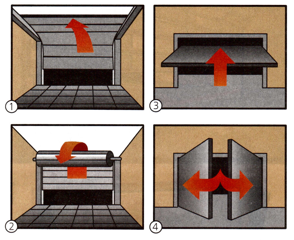 Таким образом, когда ворота открыты, их полотна располагаются параллельно потолку гаража.