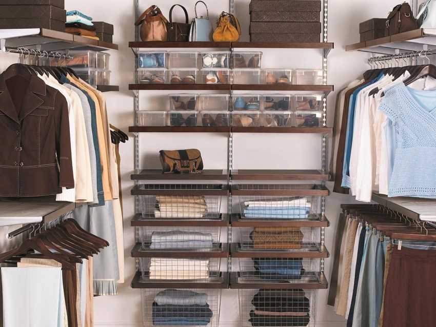 При обустройстве гардеробной используются ящики, полки и другие системы хранения.