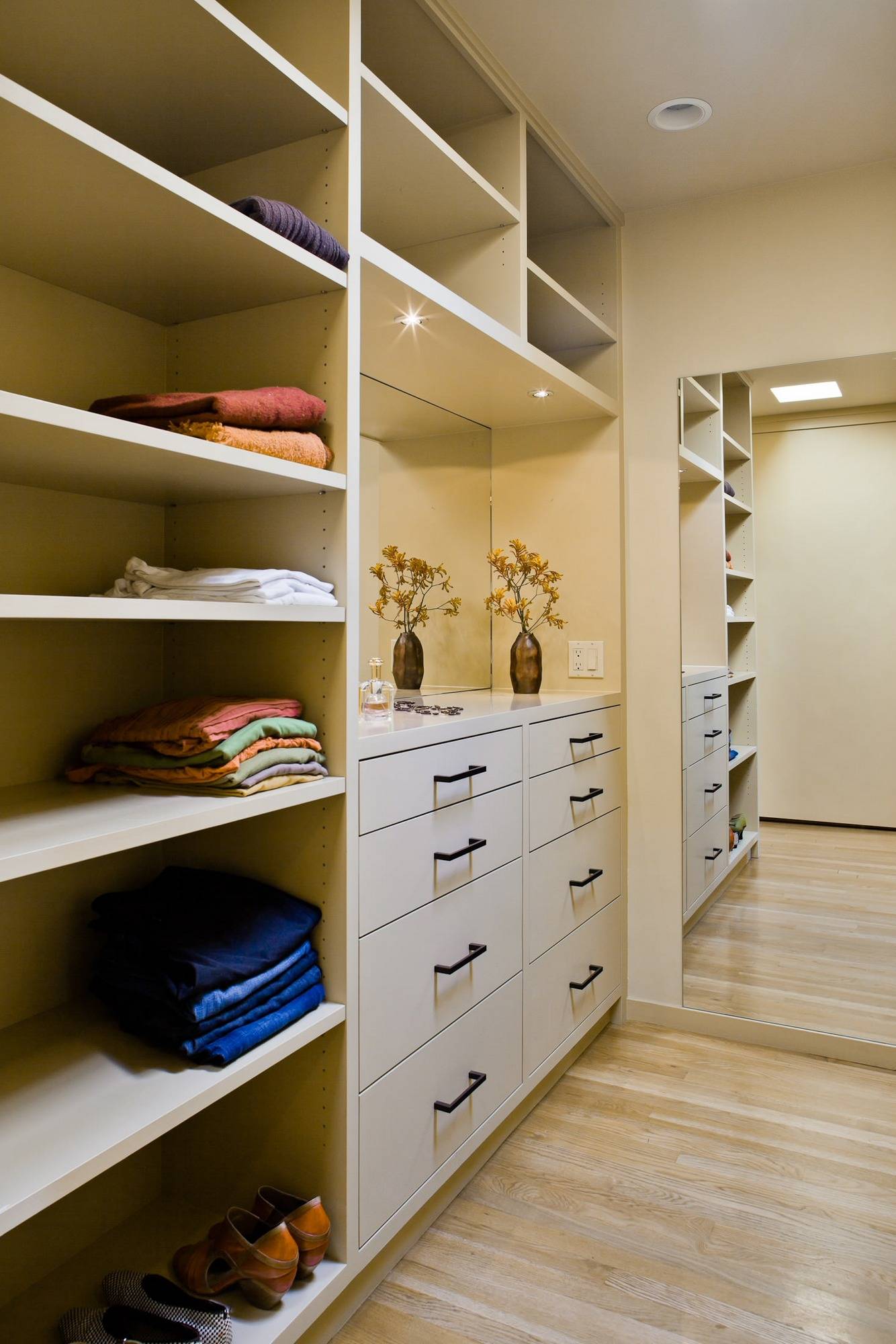 Для экономии свободного пространства рекомендуется устанавливать в гардеробной открытые стеллажи.