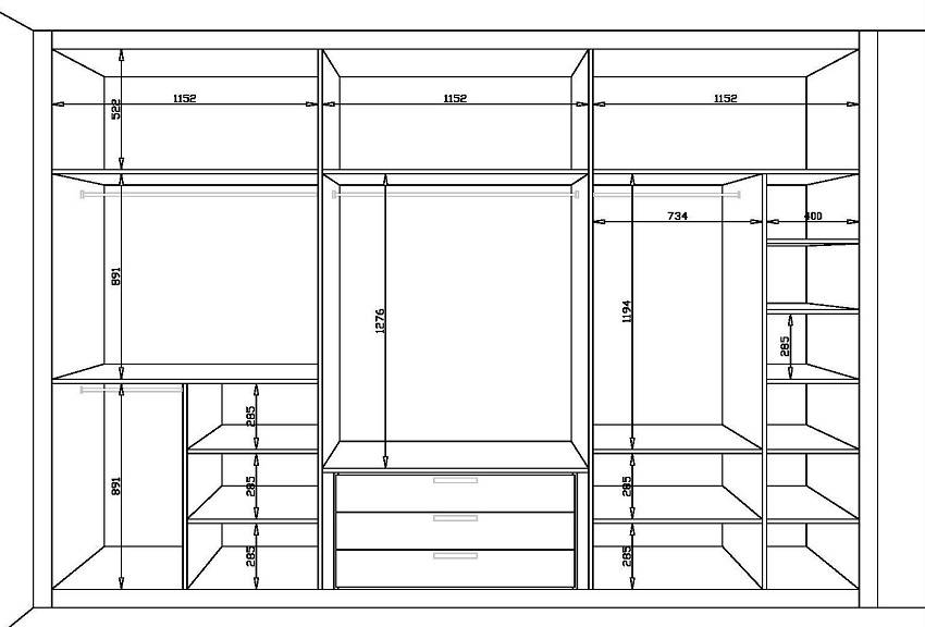 В чертежах и схемах гардеробной должны быть учтены все детали: полки, ящики, вешалки, штанги, двери и т.д. Каждая деталь должна быть правильно размещена и установлена для облегчения использования гардеробной.