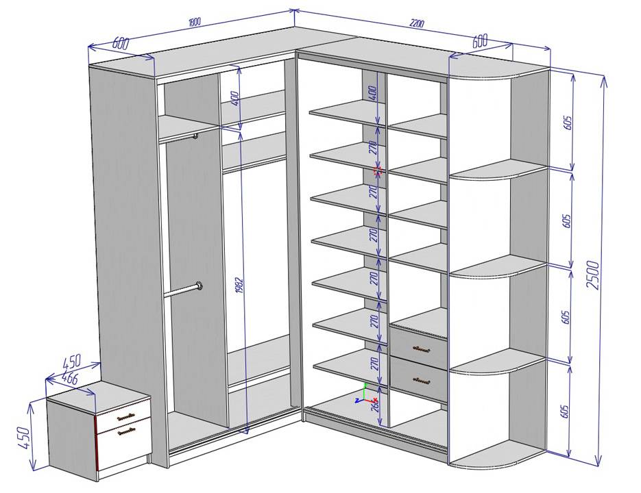 Разной формы гардеробные помещения – угловые, односторонние или с дверями-купе – требуют разной схемы и чертежа. Угловые гардеробы часто позволяют эффективно использовать угловое пространство, а гардеробные с дверями-купе удобны в случае ограниченного места.