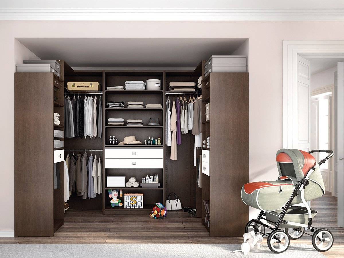 Такой вариант эффективен в комнатах с ограниченной площадью, так как системы хранения под углом 90° дают возможность хранить вдвое больше вещей, чем в обычном линейном шкафу.