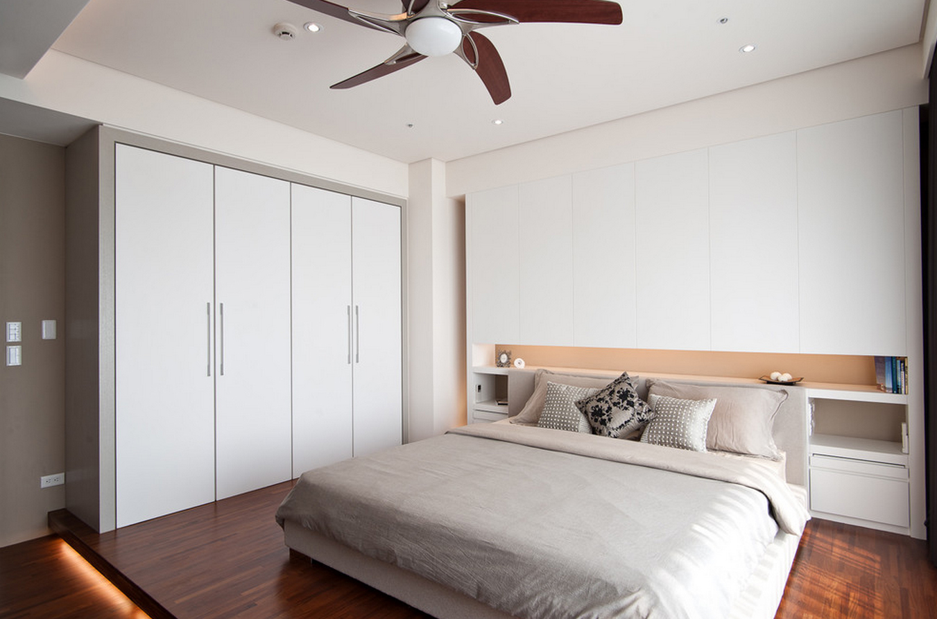 - Организовать маленькую гардеробную за изголовьем кровати. Для этого необходимо оставить минимум 50 см для глубины шкафа или гардеробной системы + 70 см для прохода.
