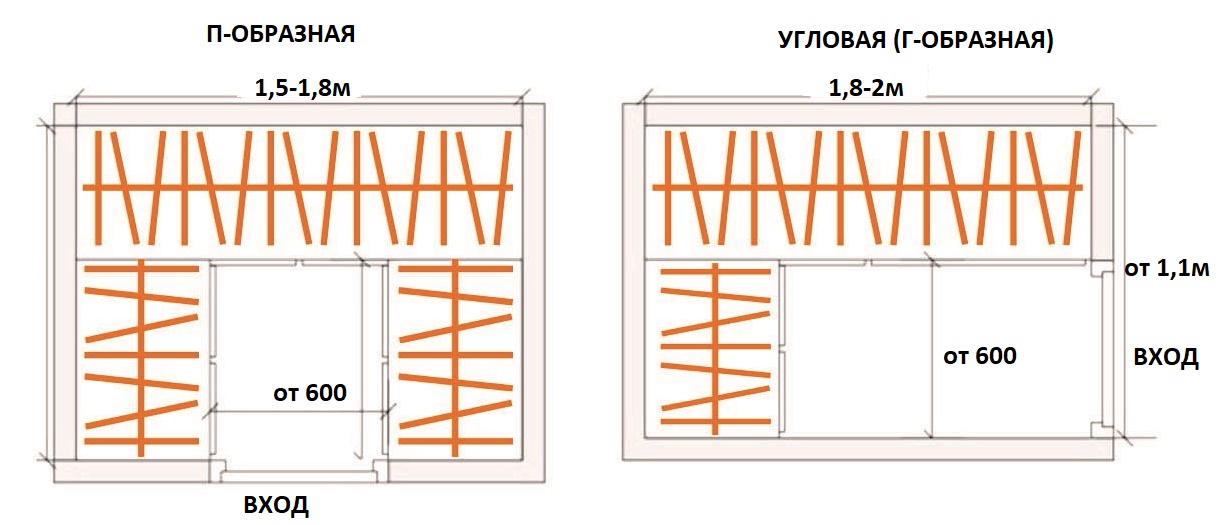 Если глубина простенка больше метра, то планировка зоны хранения может быть выстроена П-образно, с входом от центра.